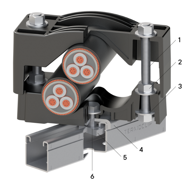 Крепеж кабельный типа ТСС 3 применяется для крепления трёх кабелей разных классов напряжения от 1 до 500 кВ, в том числе и с внешней изоляцией из ПВХ и сшитого ПЭ. Типоразмерный ряд крепежа охватывает диапазон диаметров кабелей от 24 мм до 150 мм. С динамической стойкостью к токам короткого замыкания до 150 кА.