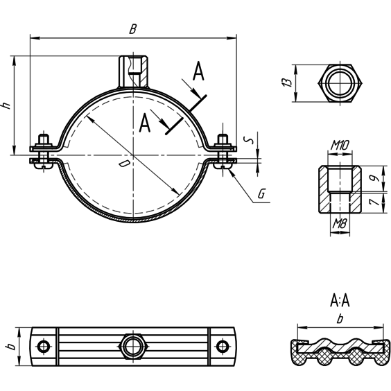 Хомут составной с виброгасителем для стандартных нагрузок PI-SD M8/M10